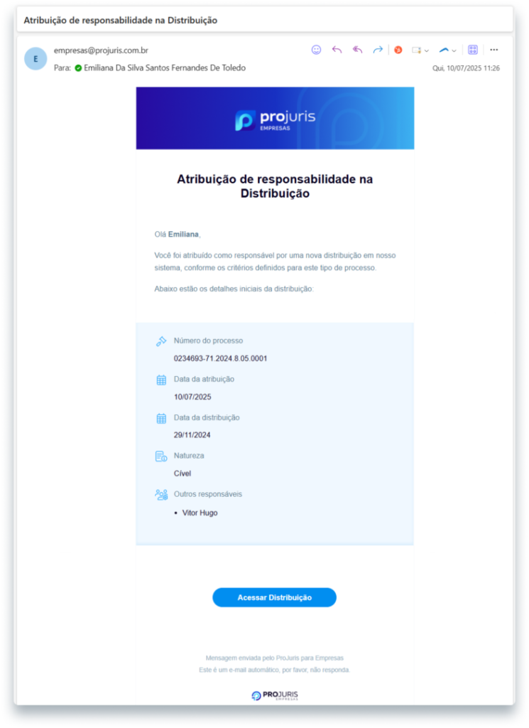 Sempre que um advogado for atribuído automaticamente, o sistema envia um e-mail contendo: