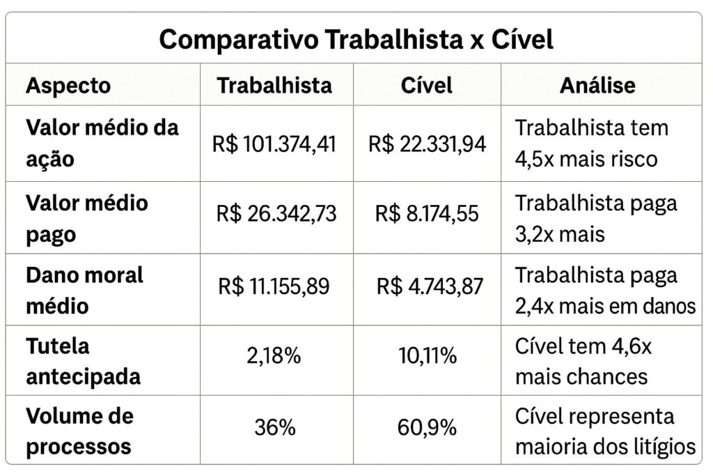 Conclusão estratégica: Embora o cível represente 60,9% do volume total de processos, o trabalhista concentra o maior risco financeiro unitário. A estratégia ideal é: