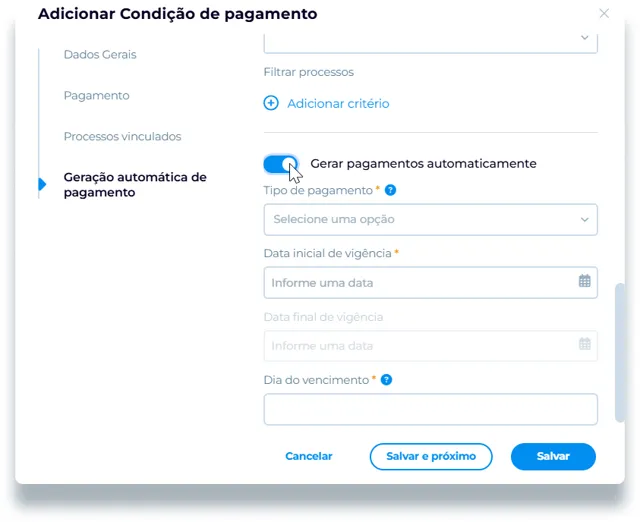 Após preencher, clique em Salvar. A partir desse momento, a condição estará apta a gerar pagamentos automaticamente nas execuções do sistema. Importante: pagamentos automáticos não são gerados para processos pré-cadastrados.