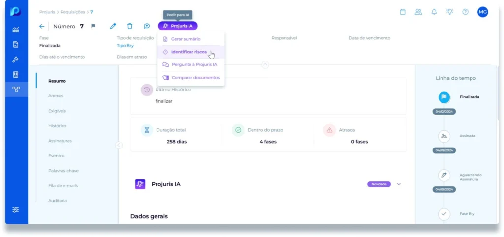 A Identificação de Riscos em Contratos com Inteligência Artificial (IA) é um recurso que analisa documentos e gera um sumário com os achados principais. A análise é executada diretamente no sistema, o que facilita histórico, auditoria interna e rastreabilidade entre versões.