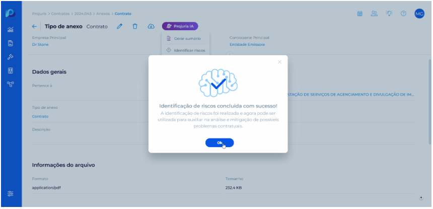 No módulo Contratos, escolha o contrato, vá até a Aba Anexos, abra o detalhamento do arquivo e clique em Projuris IA > Identificar riscos.