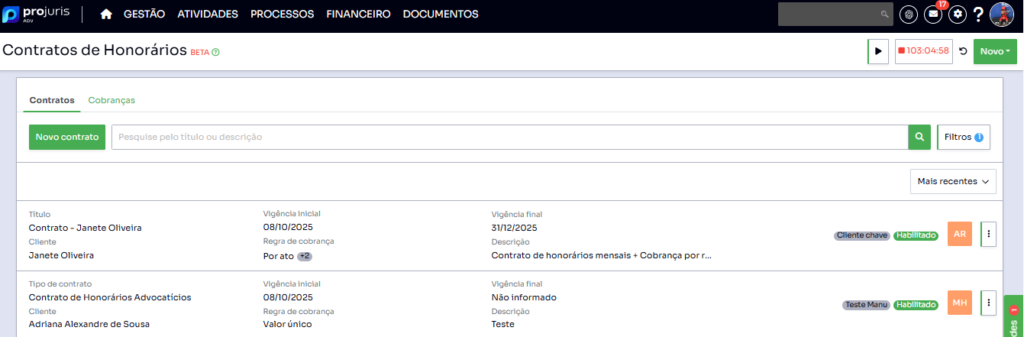 Esse é um dos grandes diferenciais do módulo: ele permite registrar diferentes regras de cobrança em um único contrato, adaptando-se a qualquer modelo de negócio jurídico. Veja alguns exemplos: