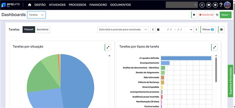 A nova funcionalidade de Dashboards de Tarefas oferece gráficos interativos com dados reais do sistema, permitindo uma análise visual e estratégica da atuação do escritório.