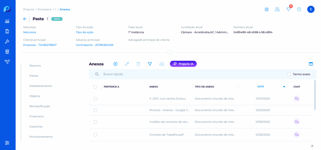 Para iniciar, o usuário acessa a opção “Pergunte à Projuris IA” a partir das abas Resumo ou Anexos de um registro. Em seguida, seleciona um documento válido (formatos PDF, DOC ou DOCX) e clica em “Analisar com IA”. O sistema processa o arquivo e abre o chat com as seguintes informações:
